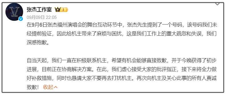 张杰工作室发文就“号码未提前验证”带给机主困扰与麻烦道歉,承认是自己工作上的重大失误和疏忽。同时,表示从事发当天就一直积极寻找,希望有机会直接道歉,目前已联系上机主正在商量协商方案。接下来会全力做好补救措施,虚心接受批评与指正,恳请大家不要再打扰机主,并向所有关心此事的朋友道歉。