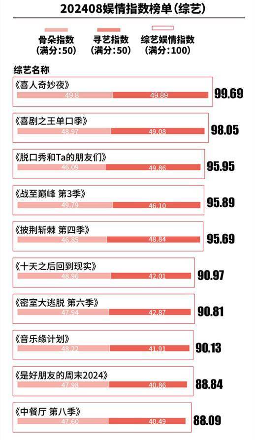综艺方面,喜剧类综艺在8月表现尤为突出,强势占据娱情指数榜单的前三。《喜人奇妙夜》更是以99.69的亮眼成绩持续登顶,可谓是暑期档综艺赛道的MVP。此外,爱奇艺、腾讯两大平台推出的脱口秀竞演综艺《喜剧之王单口季》与《脱口秀和Ta的朋友们》同期对打,目前来看差距还不是很大,率先播出的“喜单”以2分左右的优势暂居领先位置。