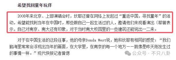 回到美国后,侃爷也多次提过在南京生活的经历,因为读了南京当地小学,他中文比妈妈强,当时甚至能够在餐馆给他妈当翻译,但现在已经快忘光了。