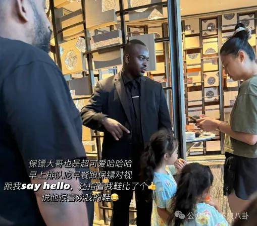 侃爷出行,怎可能不带保镖,有网友在吃早餐的时候偶遇了侃爷保镖,说保镖也变可爱了,不仅和其打招呼还对其鞋子表示了欣赏。