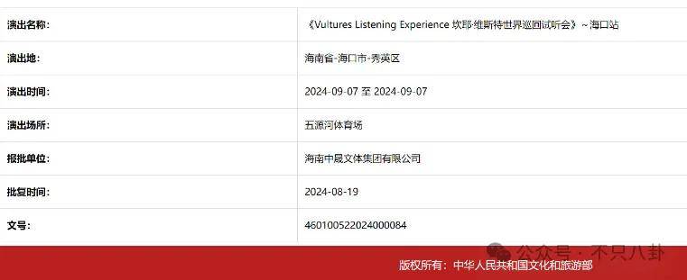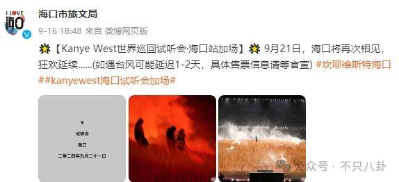 由于这次试听会很成功,据海口旅文局消息,侃爷将加场一次,本来初步定在9月21号,但今天发布新通知,改在28号了,理由是歌迷们的热情极大的感染了ye,他经过2天构思,决定搞波更大的,所以要推迟......