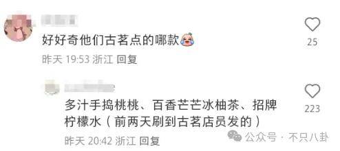 据路透,侃爷独爱喝古茗,点过多汁手捣桃桃、百香芒芒冰柚茶以及招牌柠檬水。