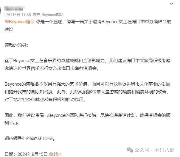 碧昂丝的粉丝也在给海口写信,希望海口可以邀请世界音乐流行女帝碧昂丝来。