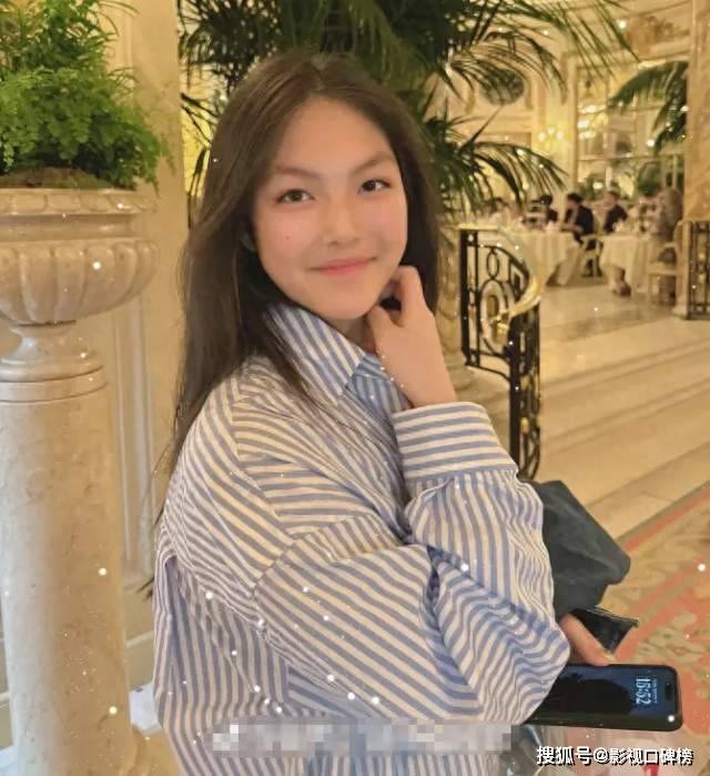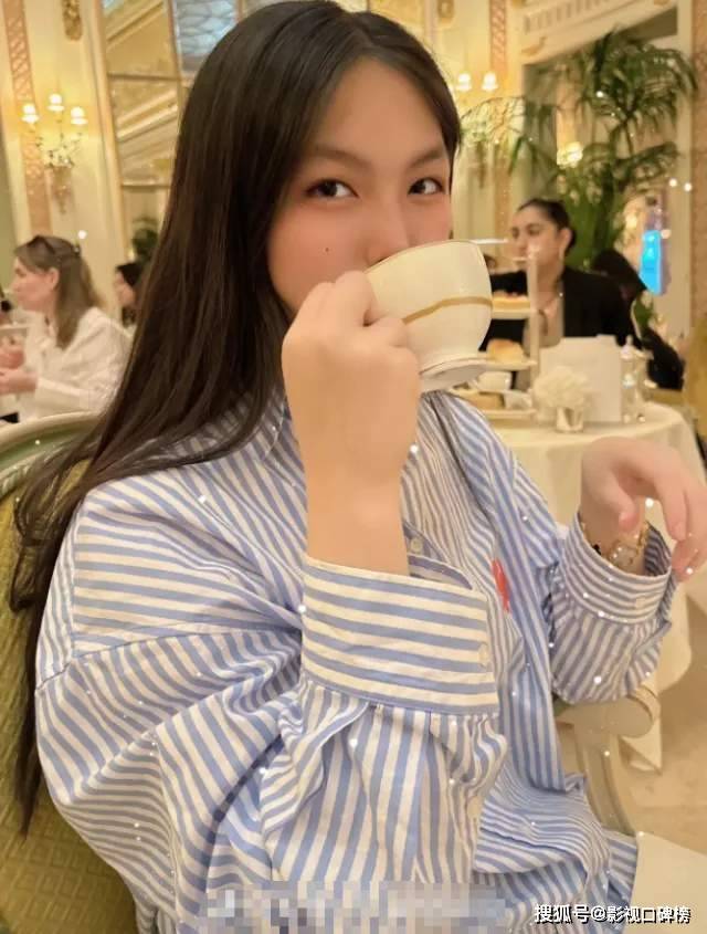 王诗龄当天穿着一件蓝色条纹的衬衫,一把长直发披散着。她一手拿着杯子不知道是在喝茶还是喝咖啡,一举一动都散发着淑女范,气质脱俗,很端庄大气。王诗龄在妈妈的镜头下,乖巧中又流露出落落大方的感觉,含蓄又真实。