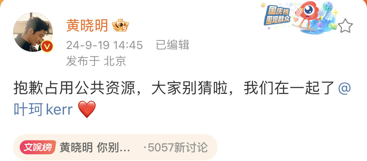 搜狐娱乐讯 9月19日,黄晓明在社交平台官宣与叶珂的恋情。有网友考古到黄晓明曾在访谈中提到“不将就”是自己最明显的感情标签,他直言:“我是相信爱情的,但是作为男人,一定要勇于争取,不会让自己的爱情走失七年”。