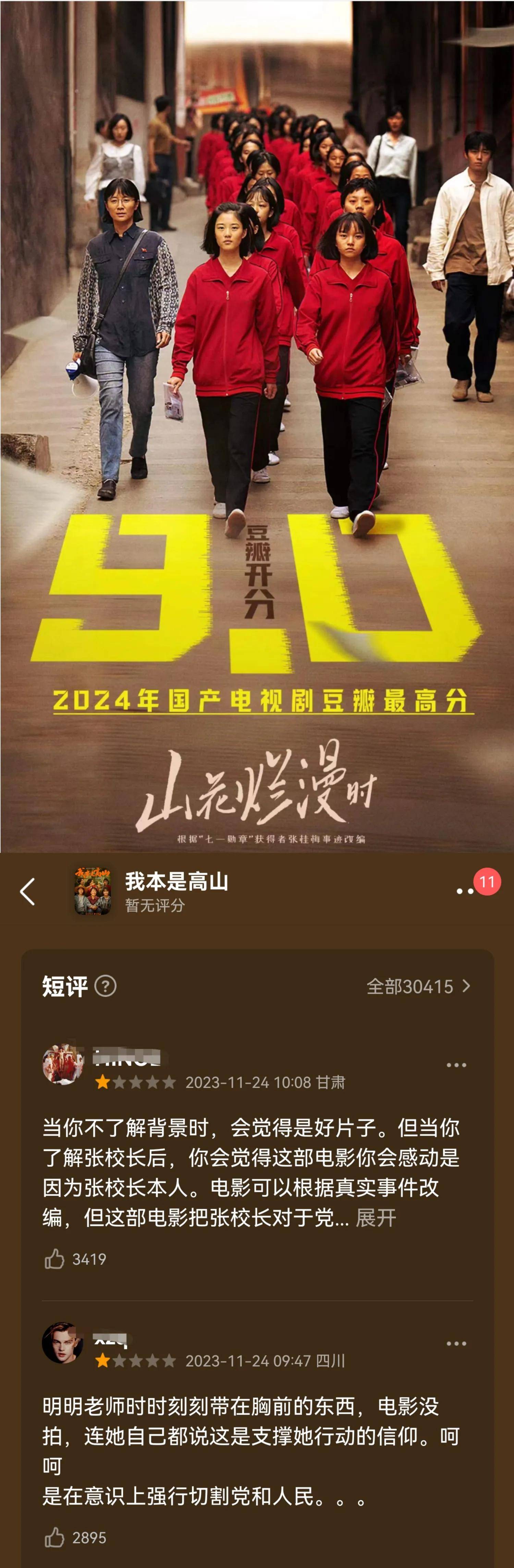 同样是讲述张桂梅老师的故事,海清主演的电影《我本是高山》上映都快一年了,豆瓣至今不敢开分,网上对于该片的争议极大,差评满天飞!