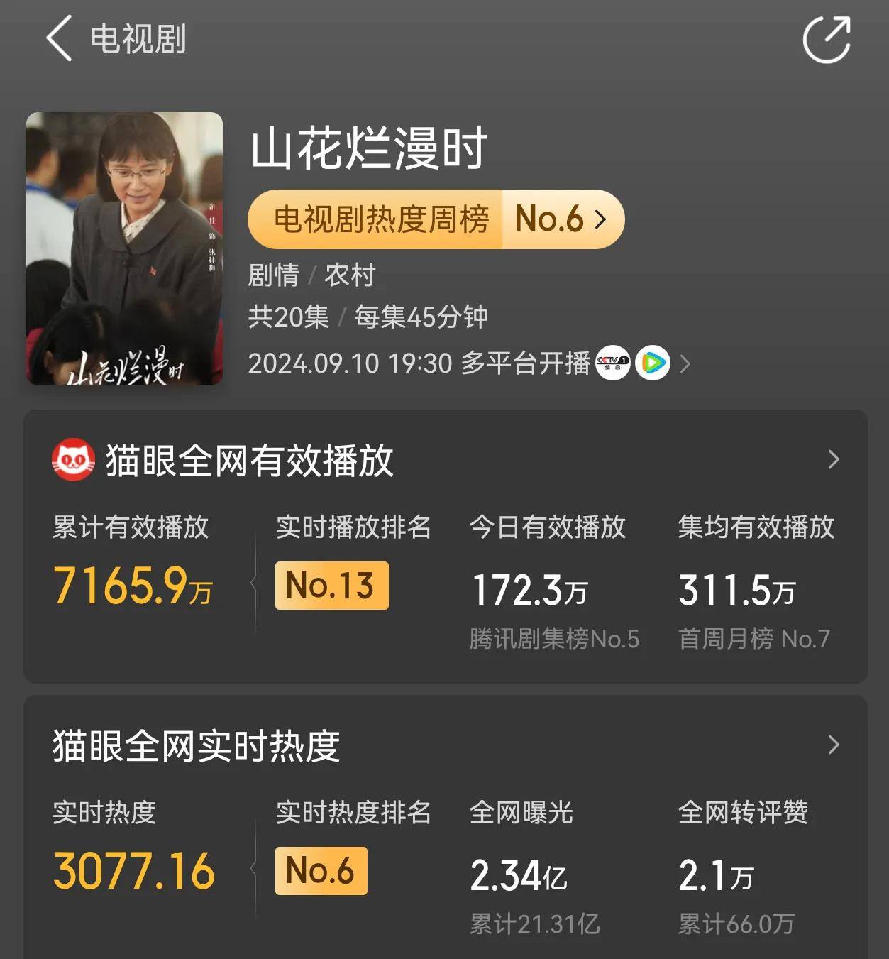 《山花烂漫时》作为央视参与出品的正剧,并且是登陆央视一套黄金档播出的剧,热度却一直是不温不火的状态。